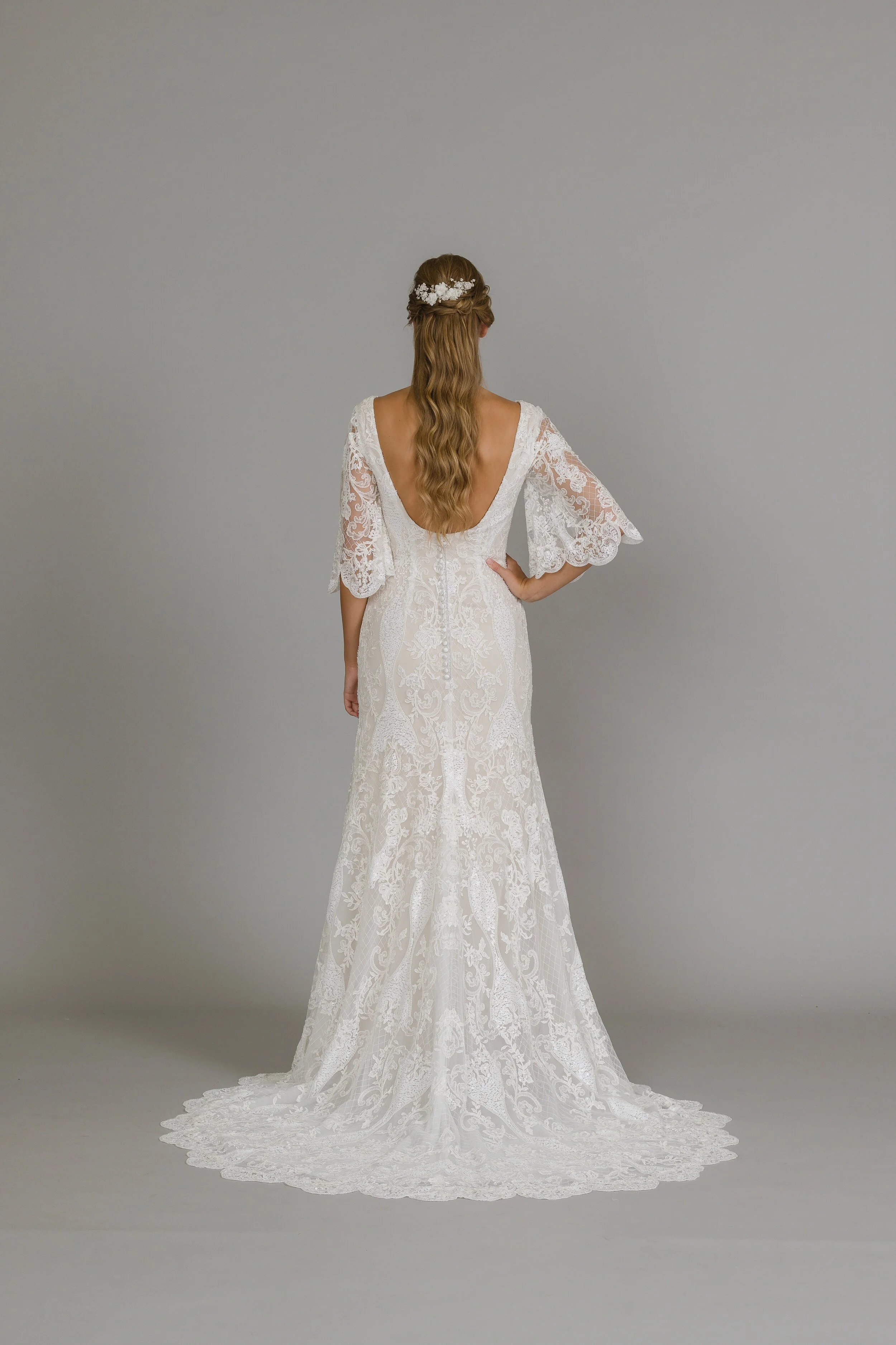 Sequinned lace, V neck, elbow length bell sleeves & sheath style silhouette. Low back with buttons down the zipper and a sweep train.
