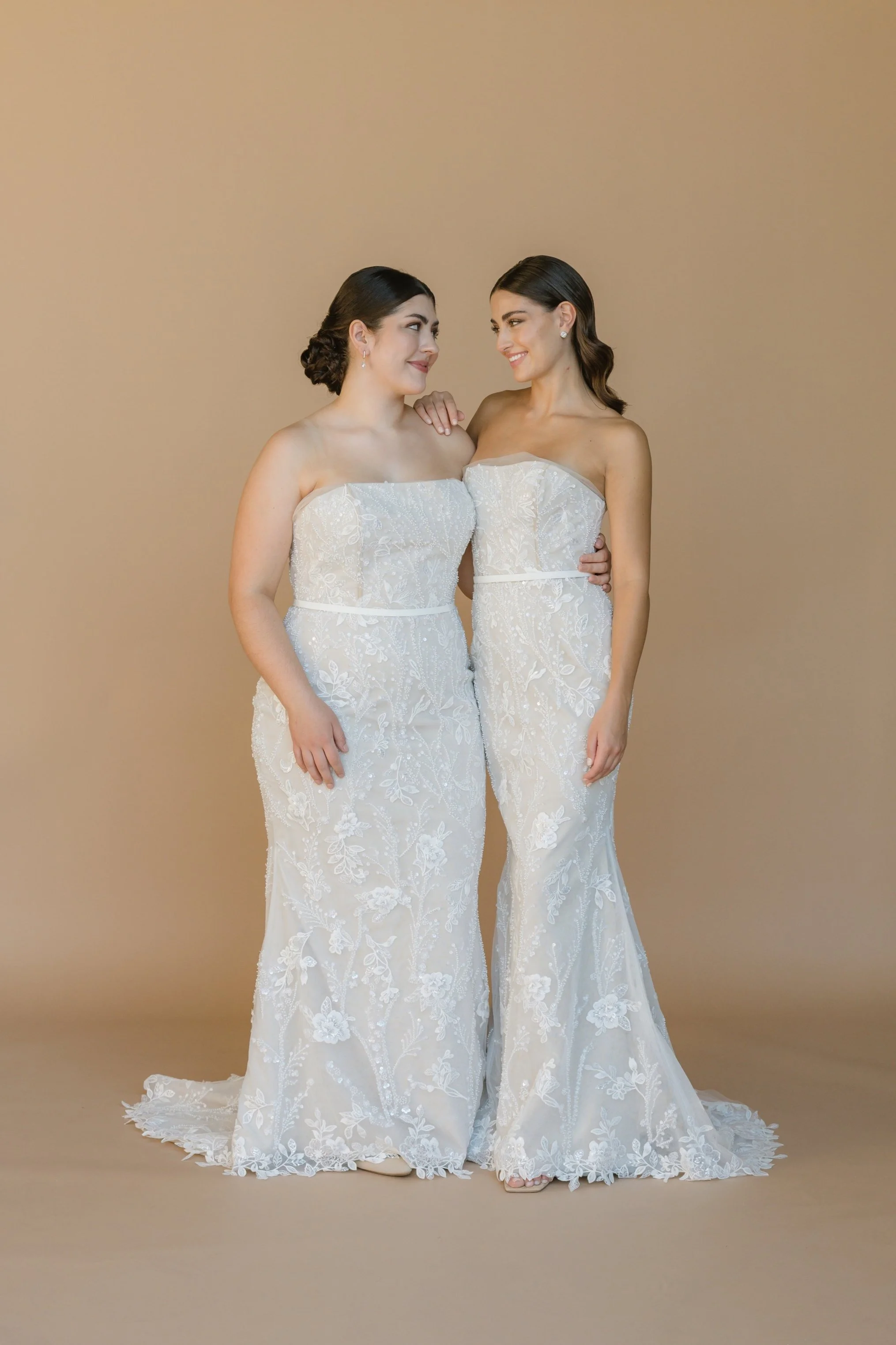 Seed bead & sequin lace overlay, strapless straight neckline, fit to flare, sweep train, invisible zip.