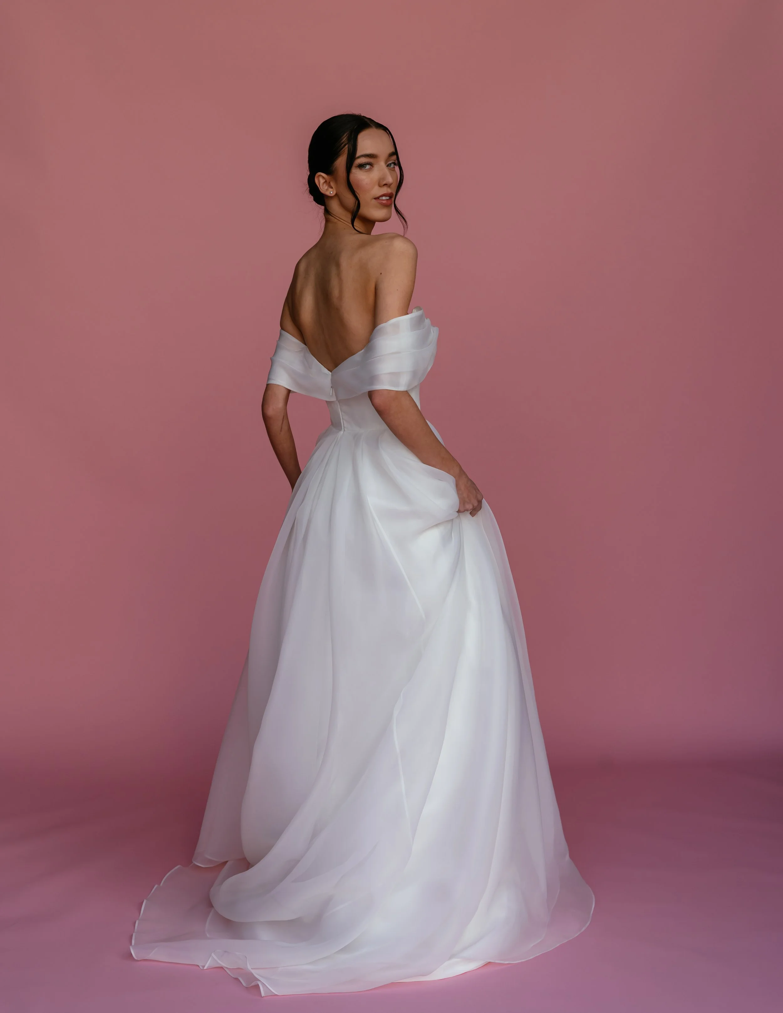 Satin organza, sweetheart neckline, pleated off shoulder straps, invisible zipper, A-line skirt, & court train.