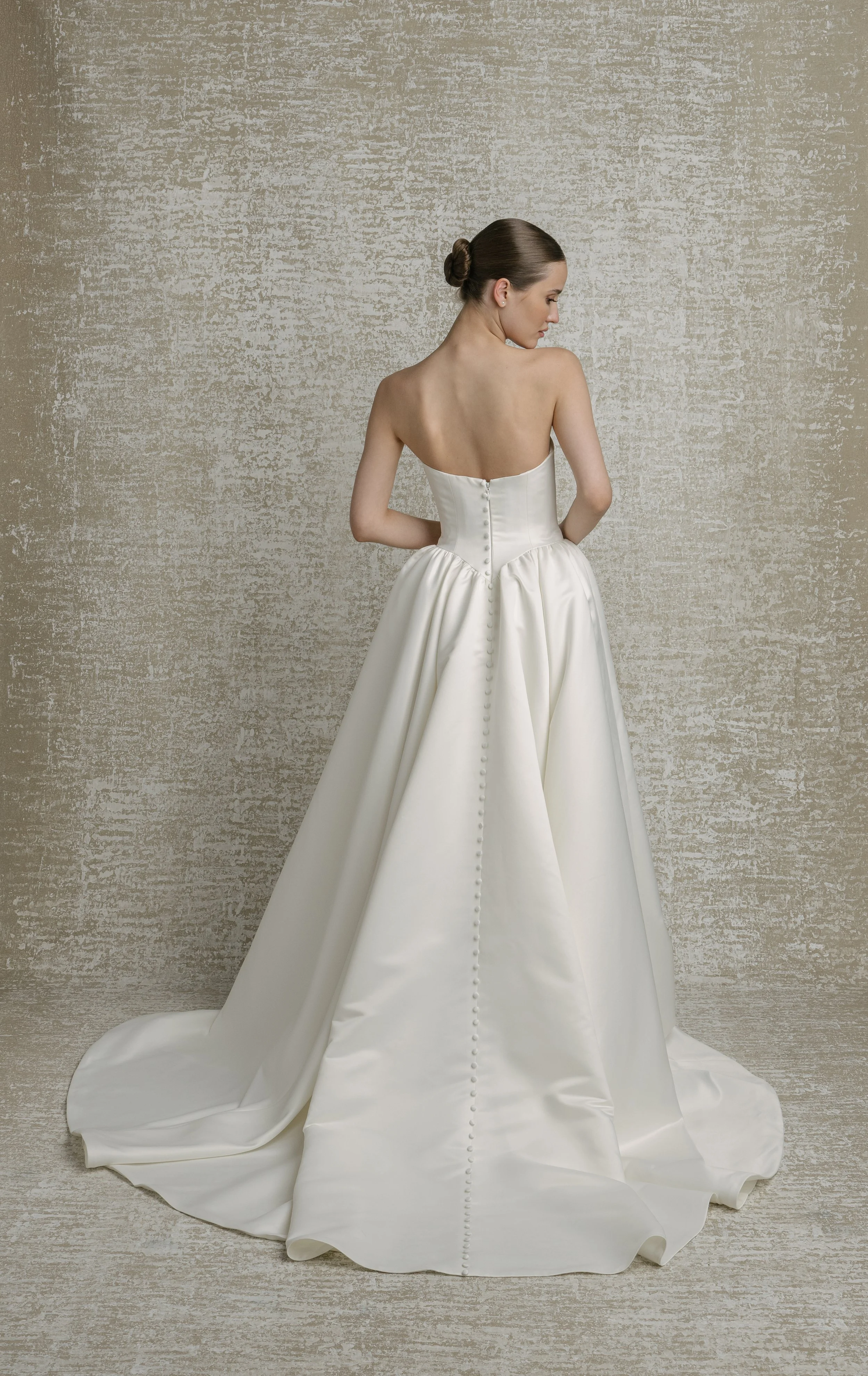 Duchess satin, cat eye strapless neckline, Basque waistline front and back, full gathered A-line skirt, zip closure with decorative buttons down chapel train.