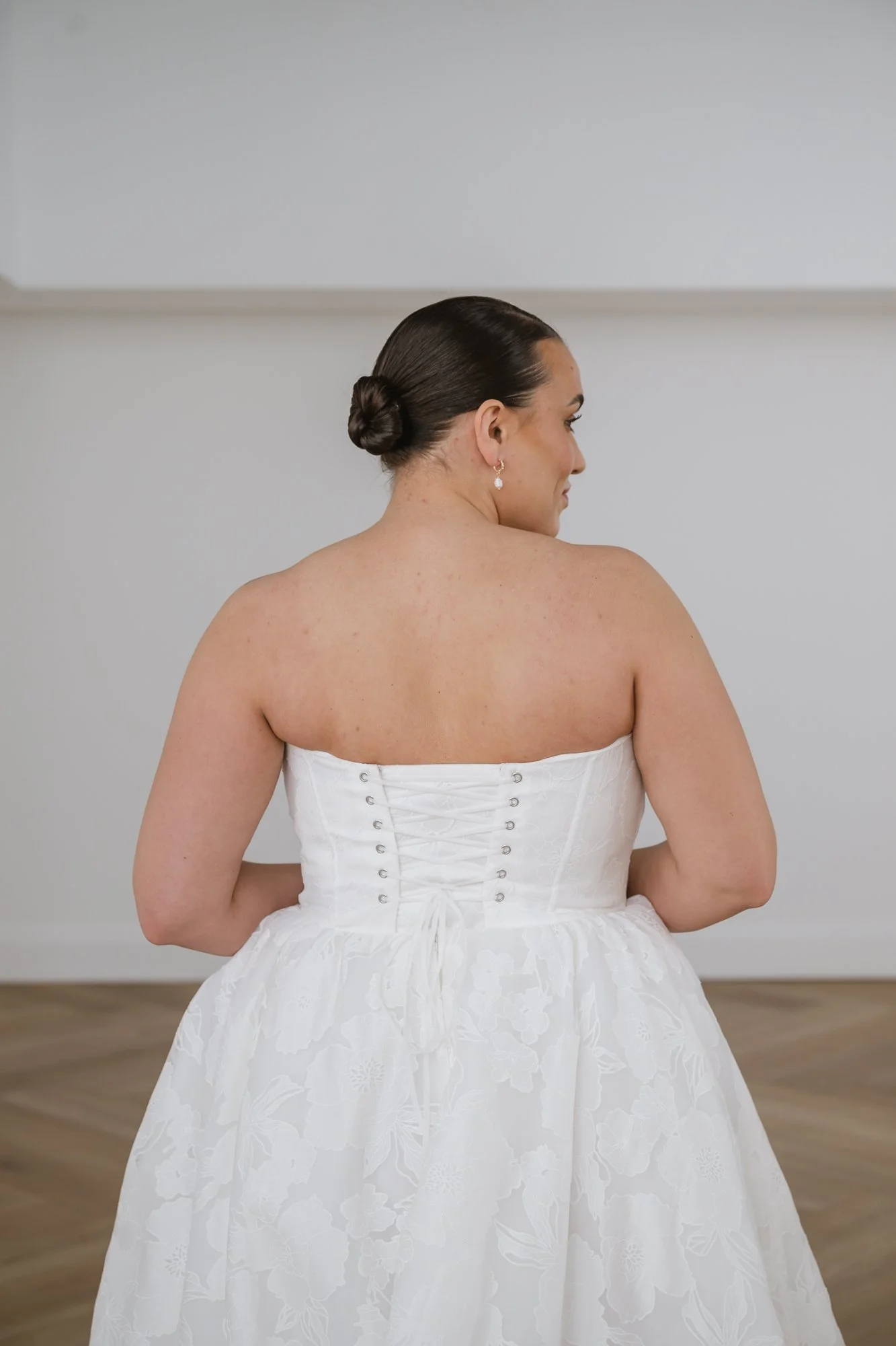 Sheet lace, strapless, sweetheart neckline, Basque waists, decorative seam design on the bodice, full A-line skirt, corset back with chapel train.