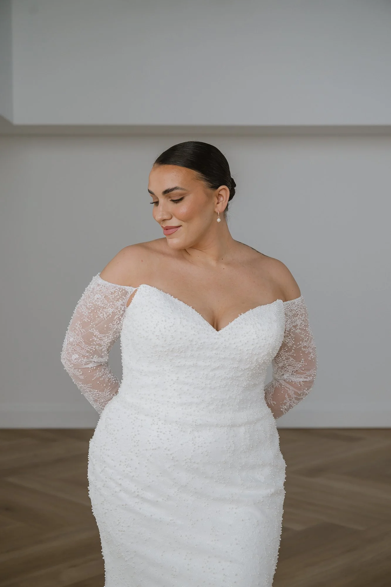 Beaded lace, modified sweetheart neckline, fully beaded dress with pearls, detachable illusion long sleeves, and train. Corset back.