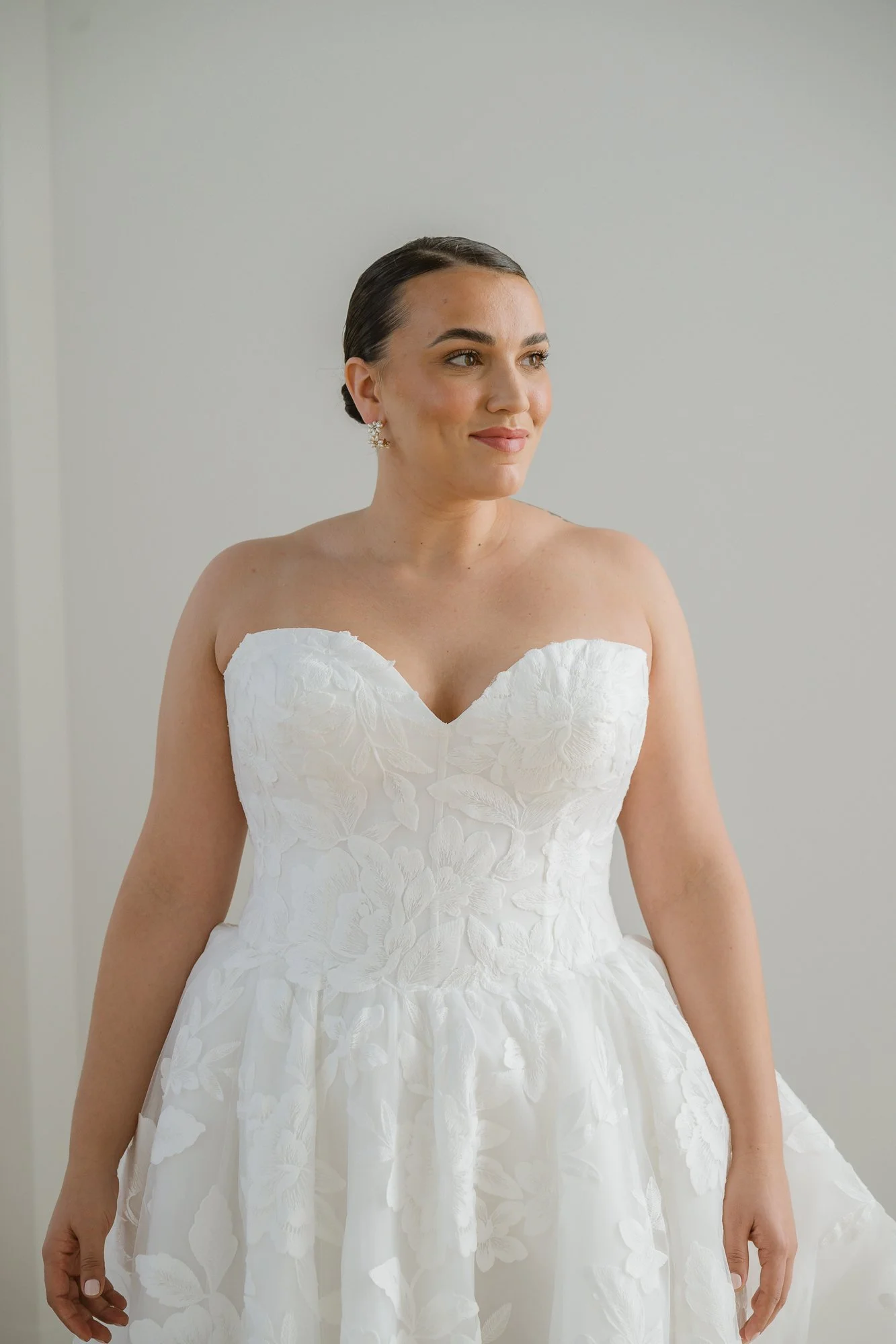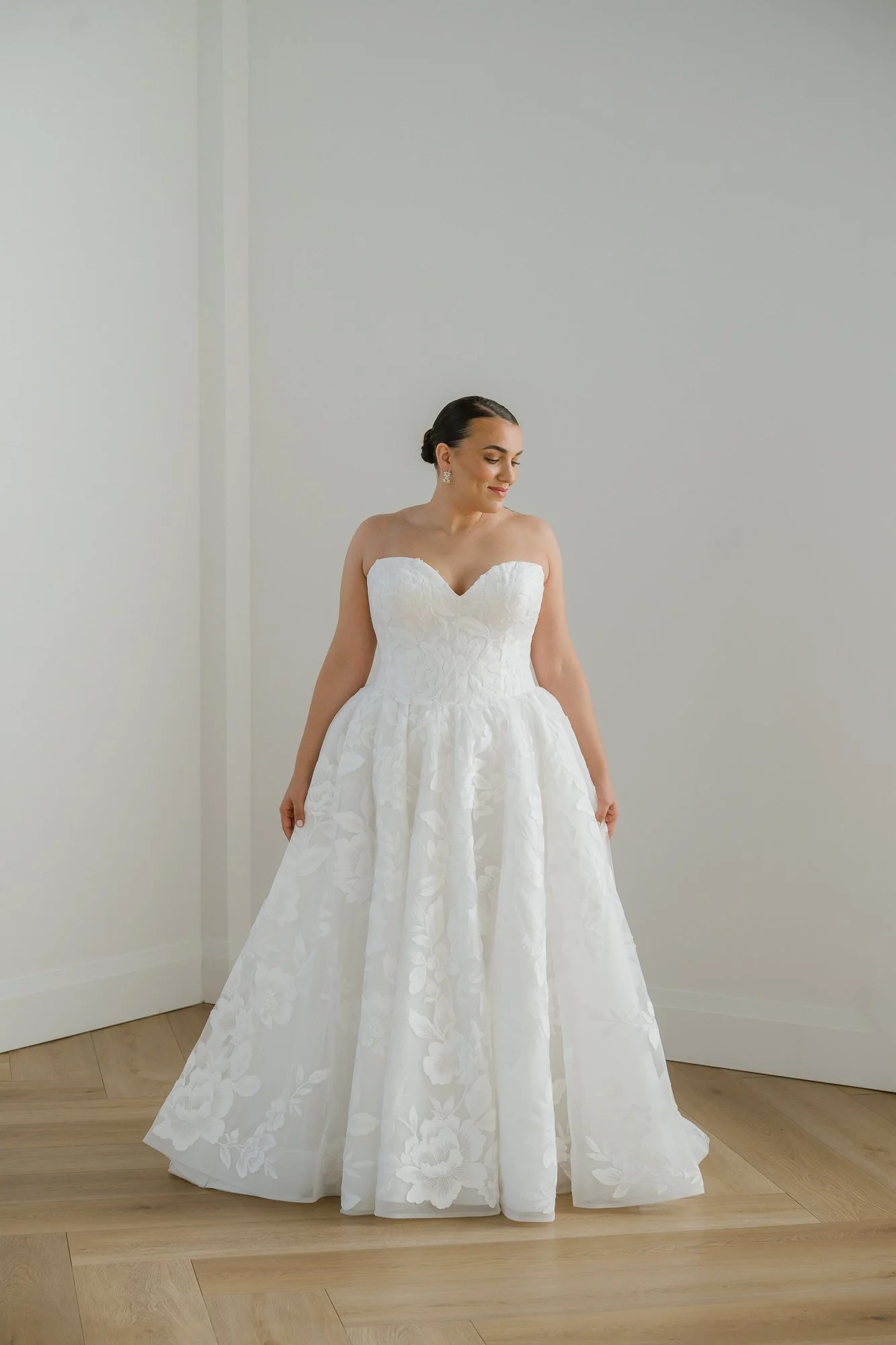 Lace appliqué throughout the dress with a sweetheart neckline, dropped waist bodice, full A-line skirt, zipper back.