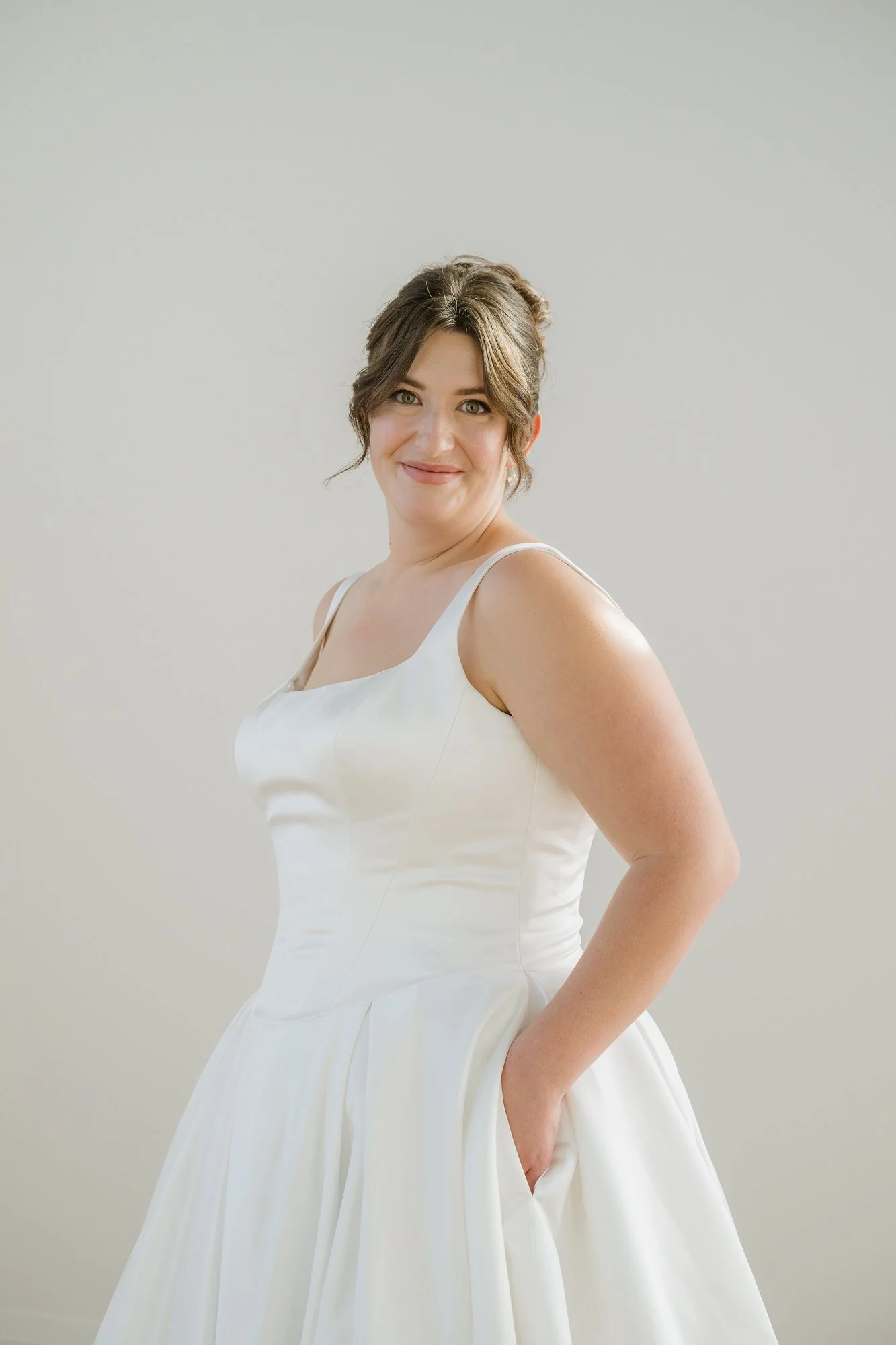 Satin, square neckline, Basque bodice with vertical seams, full A-line skirt. Mid-back scoop bodice with buttons down the back and train. Zipper back.
