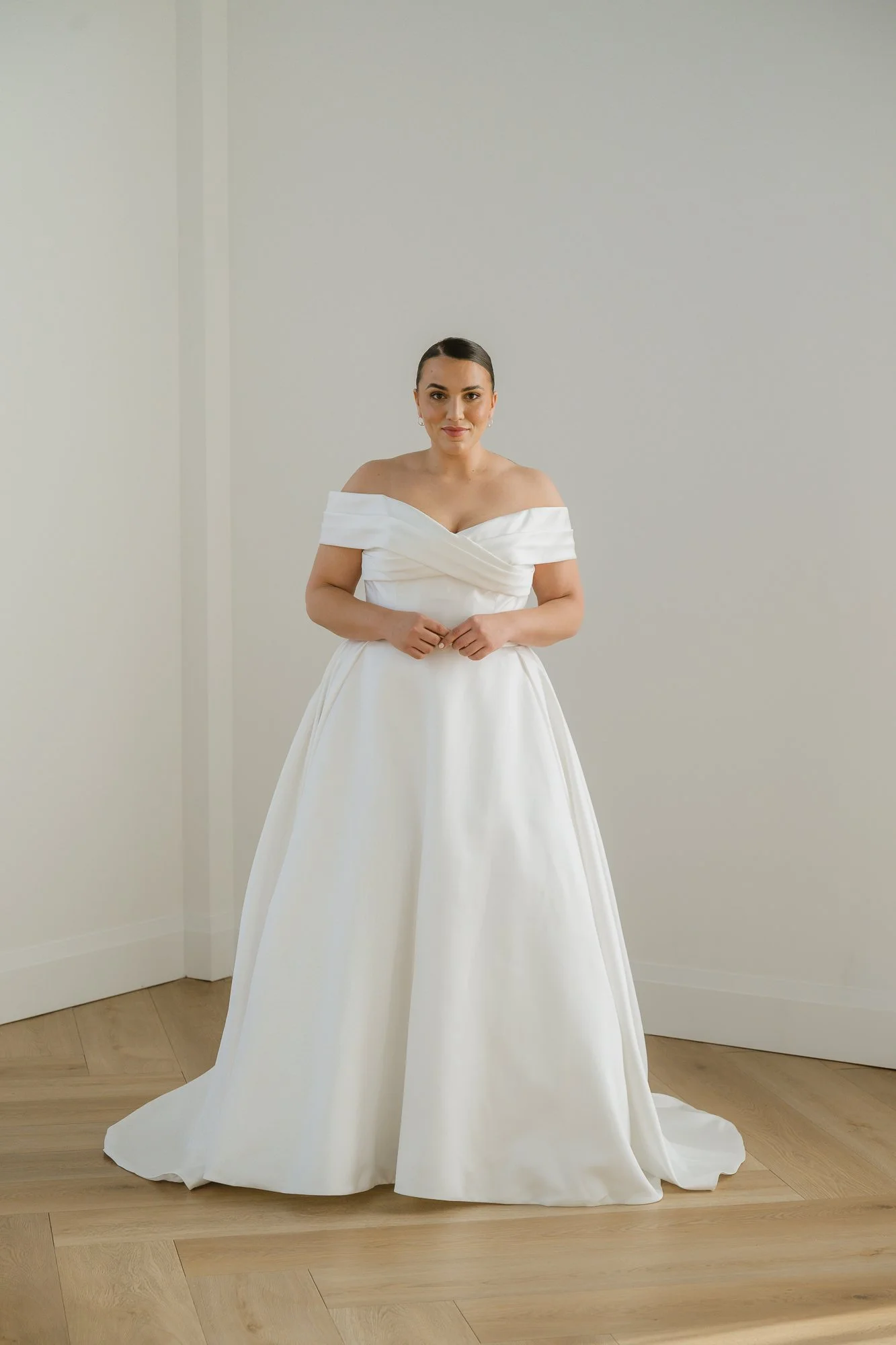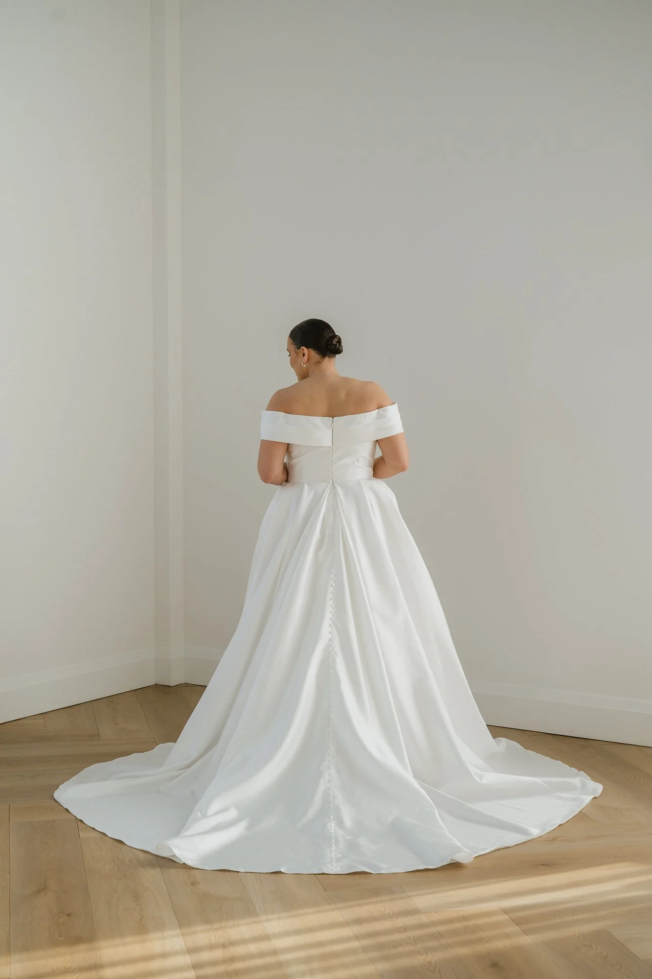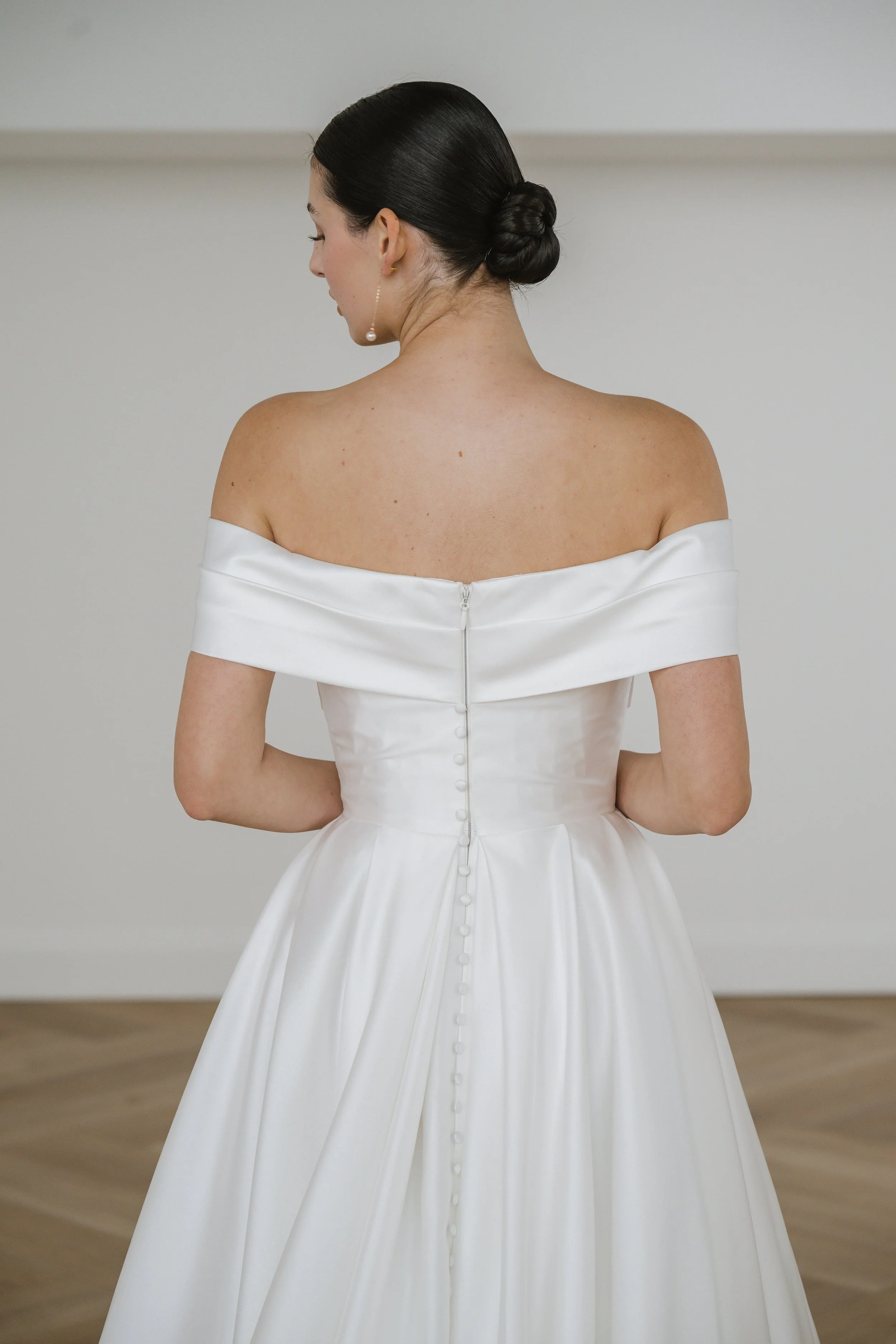 Mikado, off-shoulder, A-line gown featuring a pleated crossover neckline on bodice. The full skirt flows in a cathedral train with buttons down the bodice and train. Zipper closure.