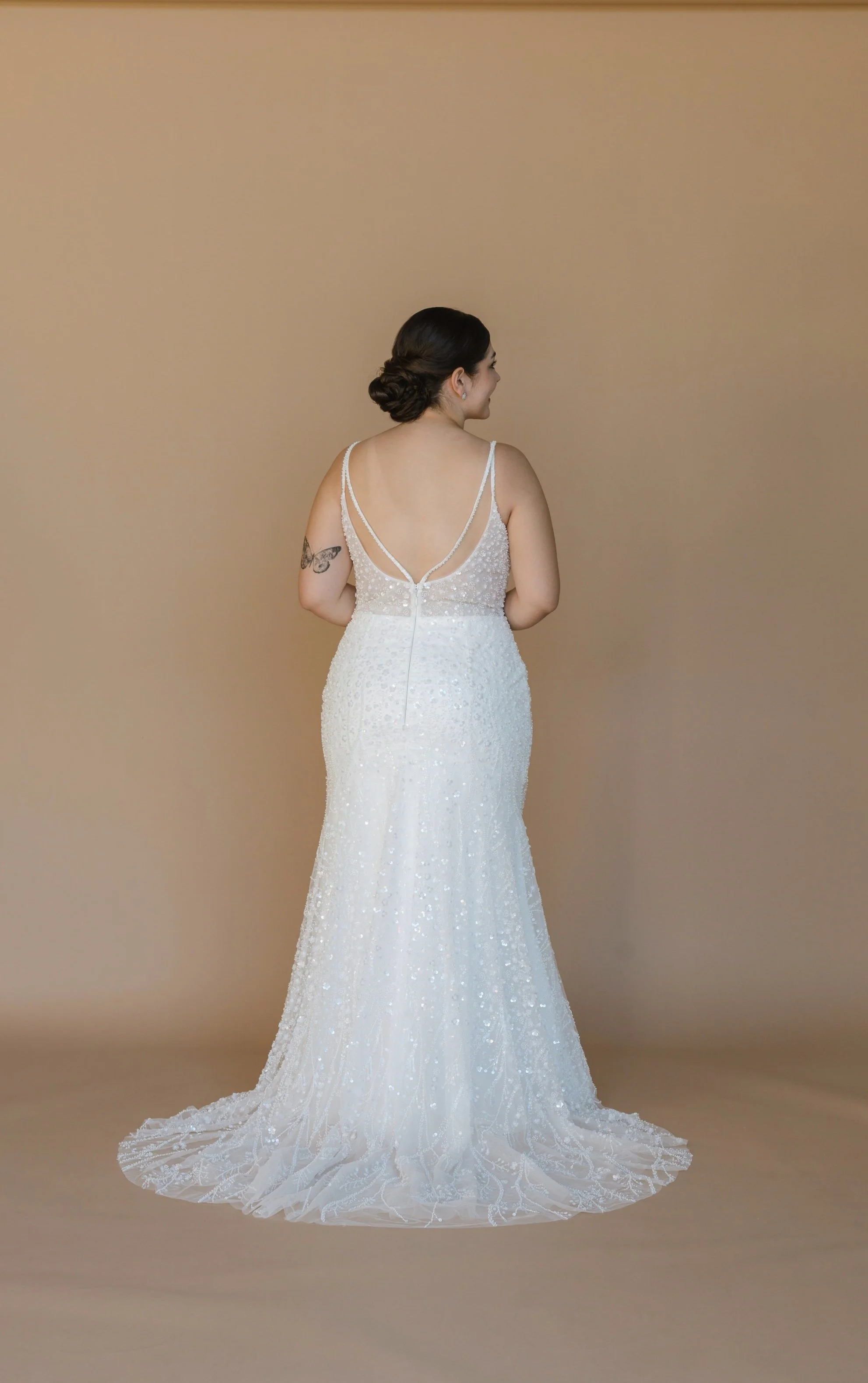 Seed bead and sequin lace overlay, sweetheart neckline with decorative boning, illusion low back with double beaded spaghetti straps, fit to flare, illusion sweep train, invisible zip.