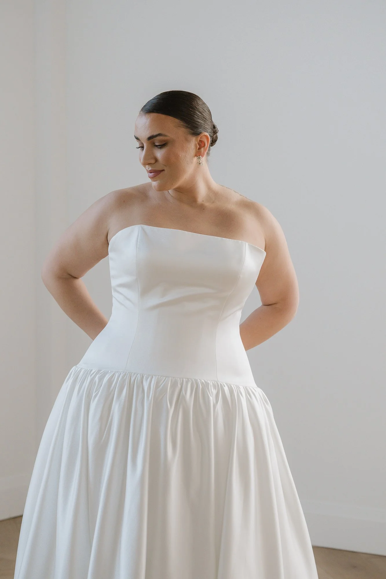 Satin, strapless straight neckline, elongated bodice with decorative buttons down the back and train.  Zipper back.
