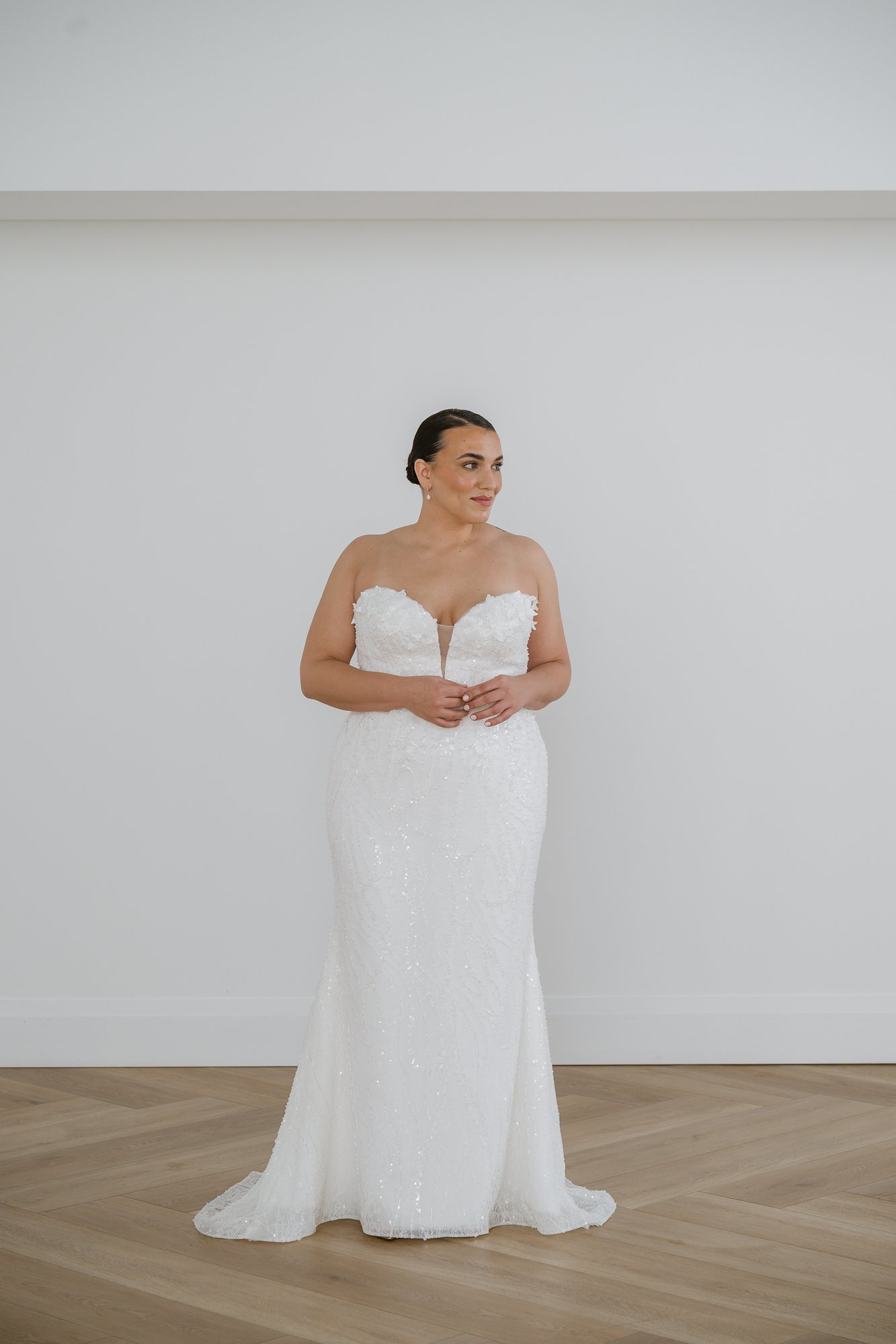 Off-shoulder gown with detachable wide straps, 3D floral appliqué on the bodice and shimmering sequin lace throughout. Soft sweetheart neckline with a plunging centre, zipper back.