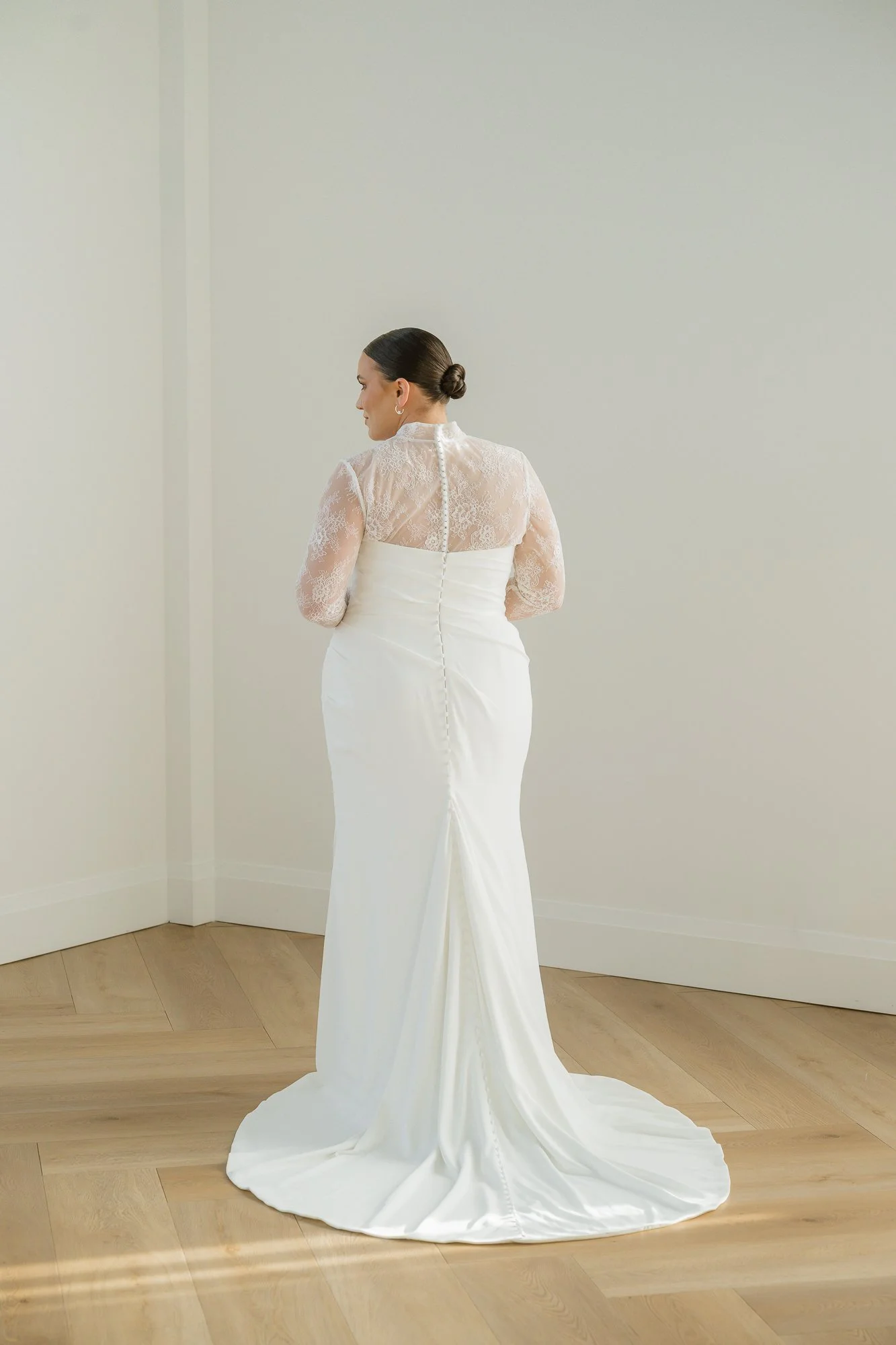 Matte chiffon with a soft sweetheart neckline, gathered and wrapped bodice and skirt. Comes with a detachable lace bolero (full length sleeves, high collar, button back). Zipper closure.