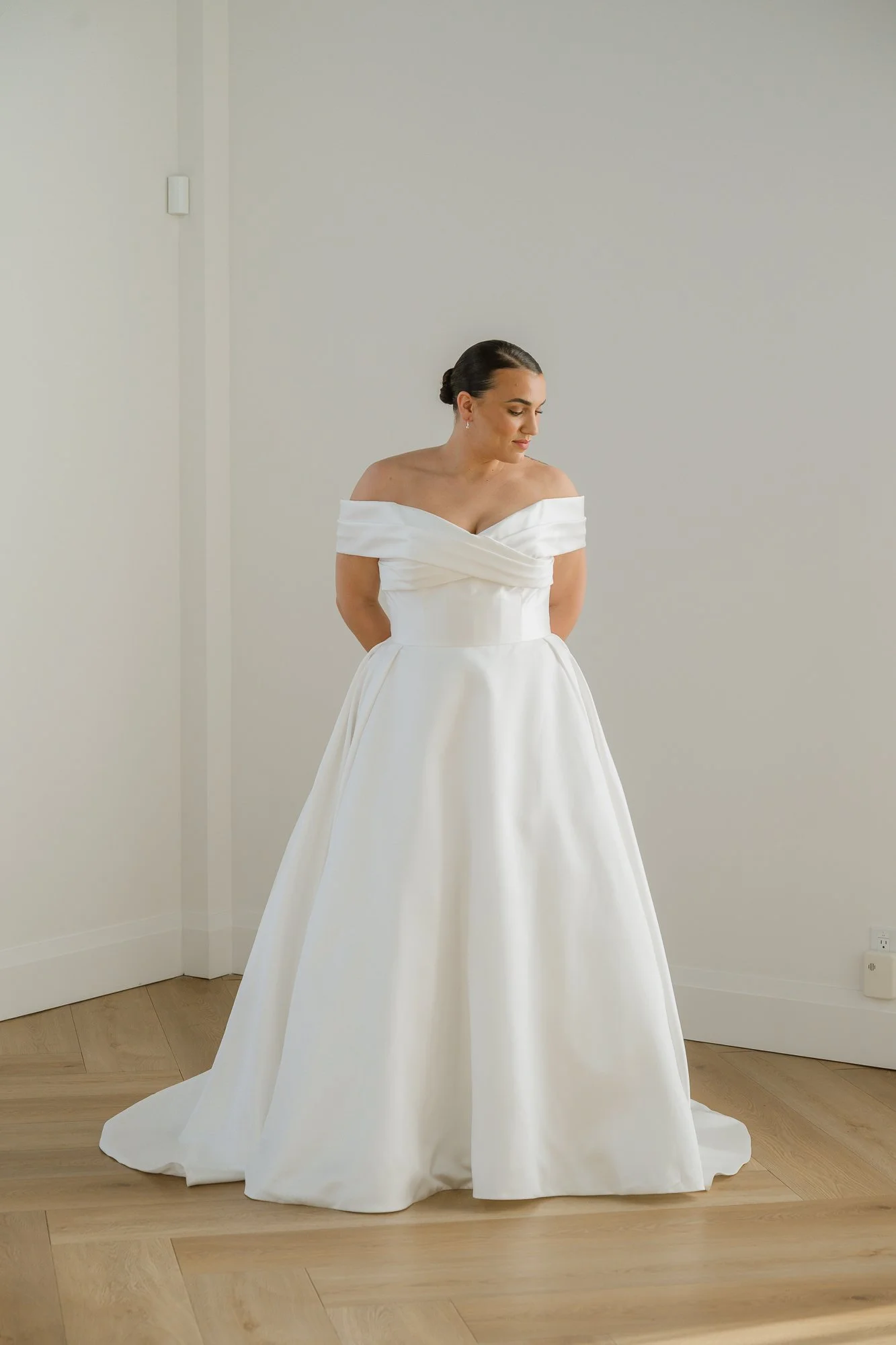 Mikado, off-shoulder, A-line gown featuring a pleated crossover neckline on bodice. The full skirt flows in a cathedral train with buttons down the bodice and train. Zipper closure.