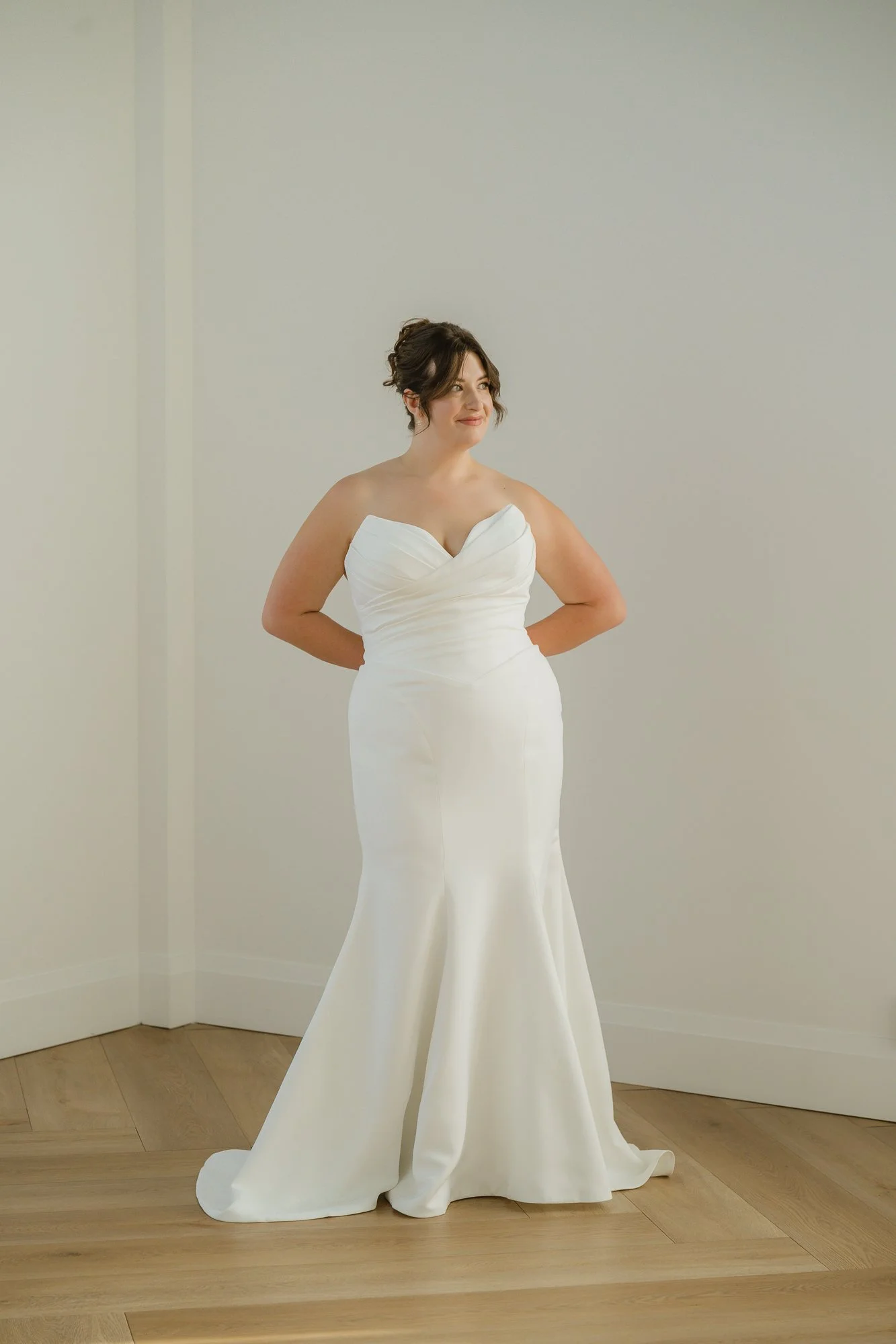 Butter mikado, sweetheart neckline with a pleated bodice. Basque waist is connected to the curved seams on the skirt’s front and back, flare above the knee. Zipper closure, chapel train.
