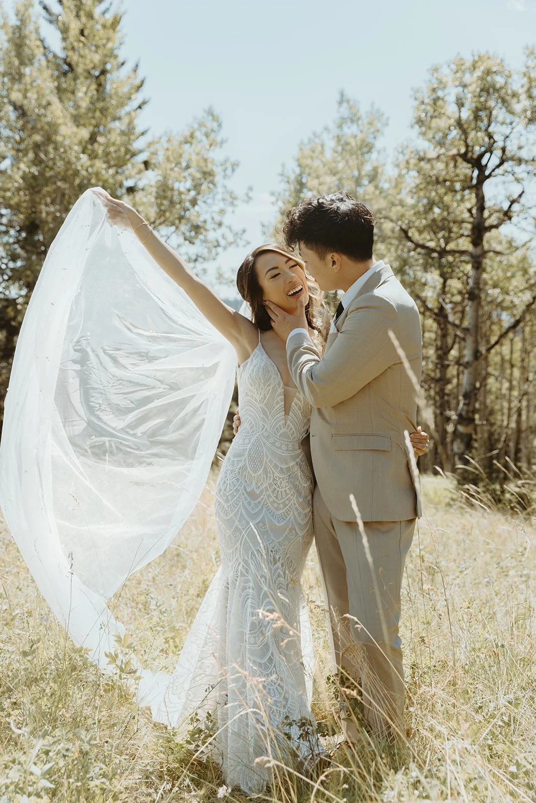 Mountain views, an open space style venue, bohemian-styled wedding, and earthy tone colour palette. Lesli and Jimmy’s micro wedding was as breathtaking as it was filled with love and laughter.