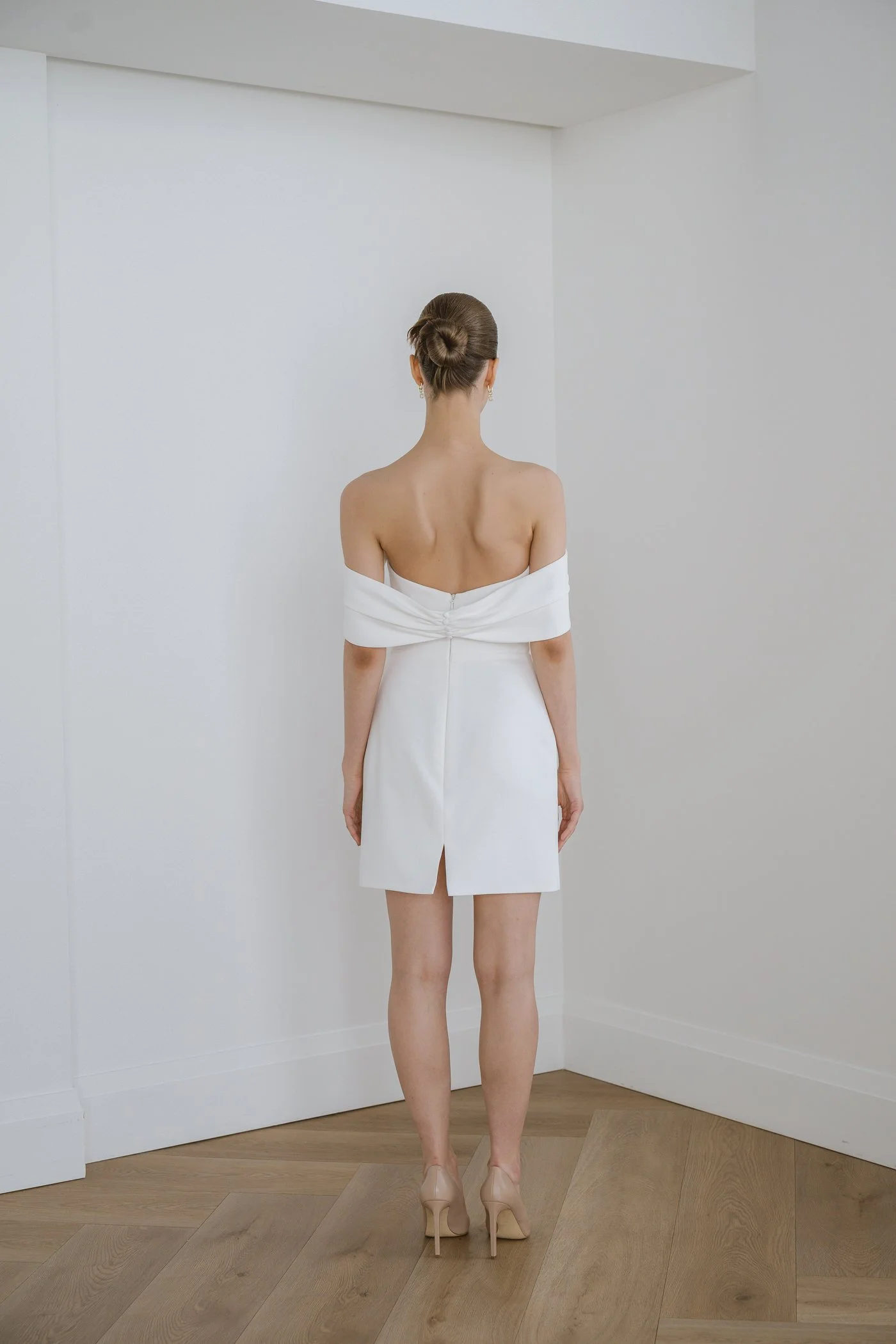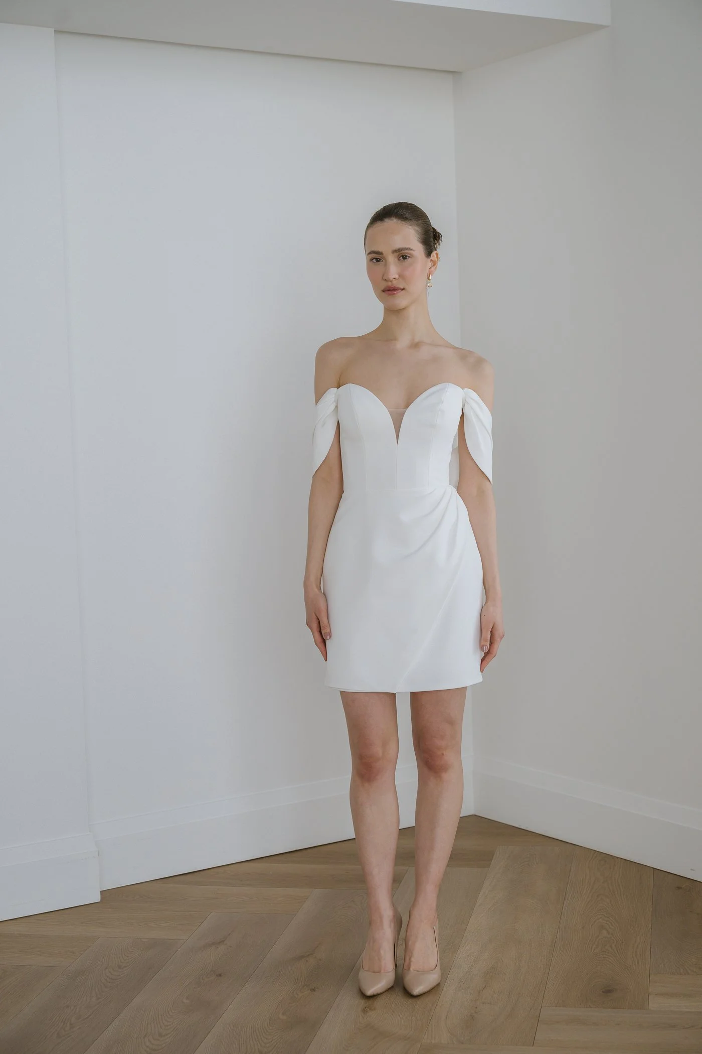 Soft Mikado crepe, sweet heart neckline with detachable off-shoulder shawl, gathered short sheath skirt, zipper back.